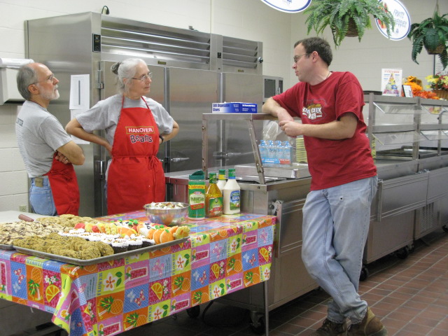 On Friday the race check-in day volunteers again gather to prepare the deserts and get food ready for the cafeteria style serving line.