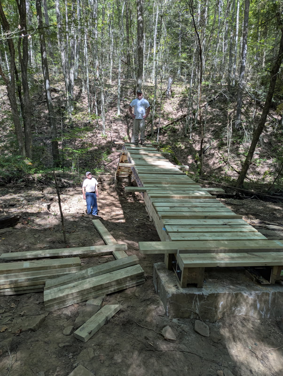In addition to removing downed trees the group keeps the yellow and white blaze trail markings visible for hikers. They maintain and replace foot bridges that traverse wet areas and small ravines. During the summer of 2025 they replaced the Bent Nail Bridge over Wolfkiel Run which was destroyed by a spring flood.